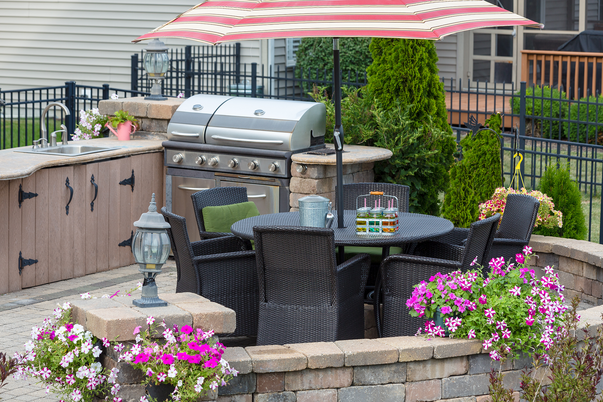 We installed a compacted base and interlocking pavers with polymeric sand for stability and drainage. The pergola’s posts are anchored to stone pillar bases that echo the patio’s materials, creating a cohesive look. Clean edges, precise cuts, and smooth transitions to the surrounding landscape make the area ready for dining and lounging the same week.